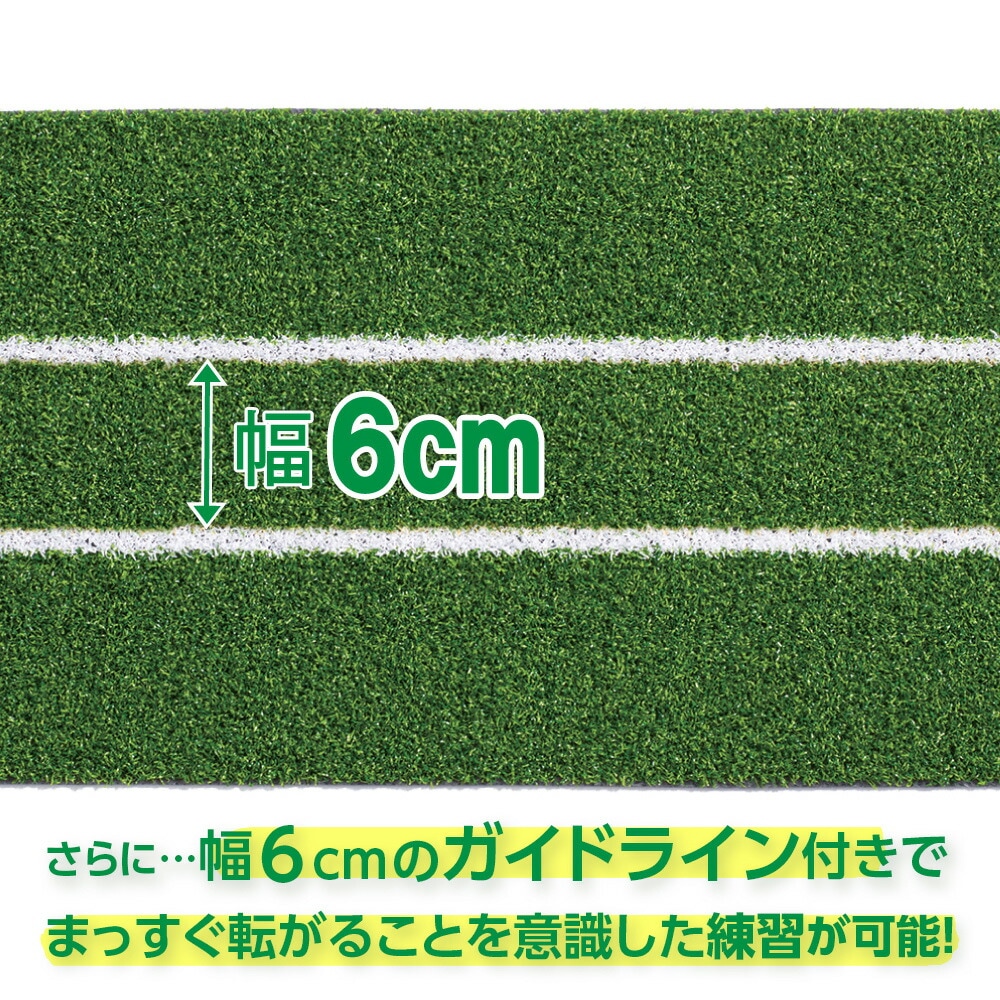 マットの中央部には6cm間隔の2本のガイドライン(アライメントライン)を白い人工芝を編み込んで引いてあります。パターをそのラインに合わせて「まっすぐ引いて、まっすぐ打つ」を繰り返し練習することで、パットの際に重要な方向性がイメージできるようになり、安定したパットを習得できます。