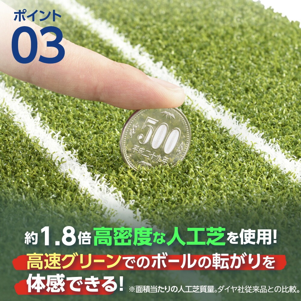 マットには、約1.8倍高密度※1な人工芝を使用することで、ベント芝に近いボールの転がりを再現しています。