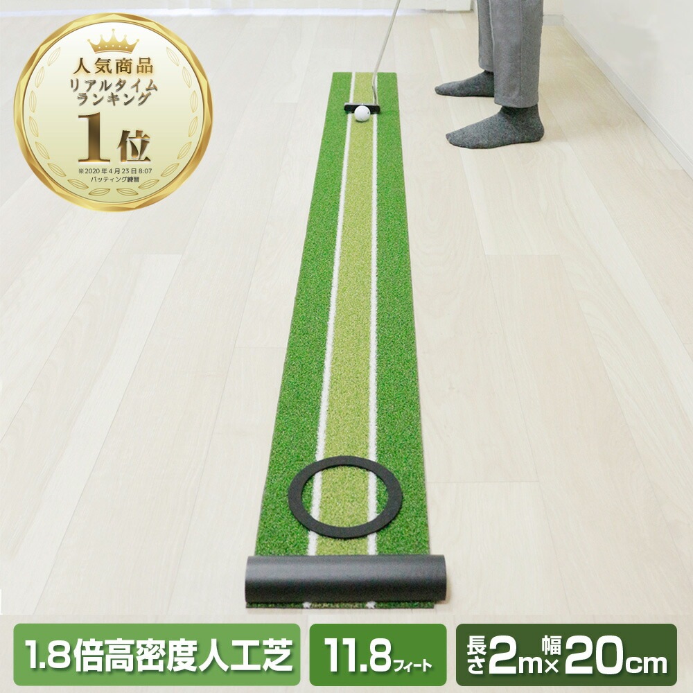 長さ2mの短めのパターマットは、自宅でも気軽に練習ができます。ボールが転がったときの音が響かないよう、人工芝の下には厚めのラバーを接着。プラスチックカップのないフラットタイプなのでカップイン時の音も気になりません。