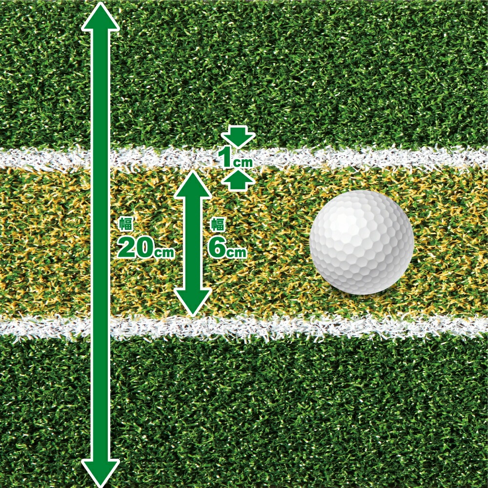 マットの中心には6cm間隔の2本の線が引いてあり、その線に合わせてパターを「まっすぐ引いてまっすぐ打つ」ことで、方向性を身に付けることができます。ガイドラインには白い人工芝を編み込んでいます。