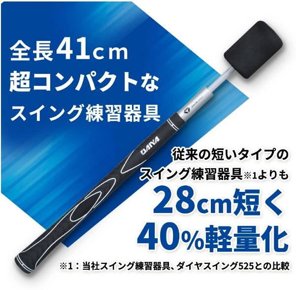 ダイヤ社のスイング練習器の中では最短の全長約41cm。室内でのスイング練習や、外出先への持ち運びもできるのでいつでも気になったときに使用できます。自宅での収納にも困りません。