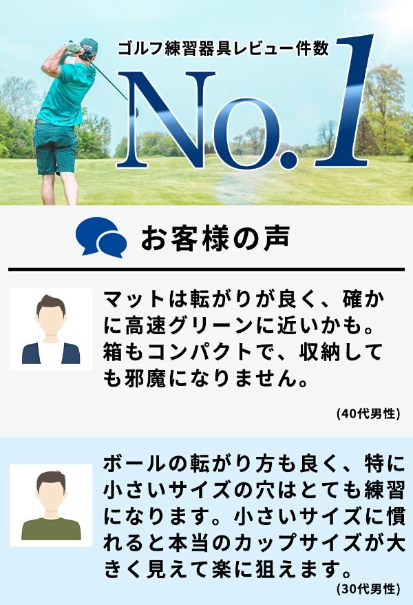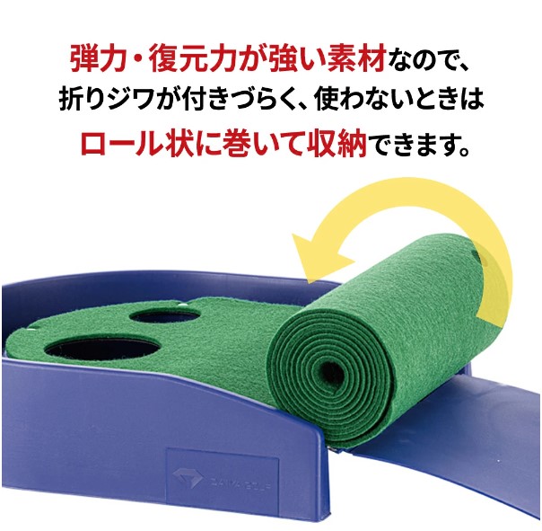 2種類のホールカップ(大:直径80mm、小:直径50mm)がパットのバリエーションを広げ、より高度なパッティング技術と集中力を養います。パッティングスタンスの上部にボールが戻るので繰り返し練習がスムーズにできるリターン機能が付いています。