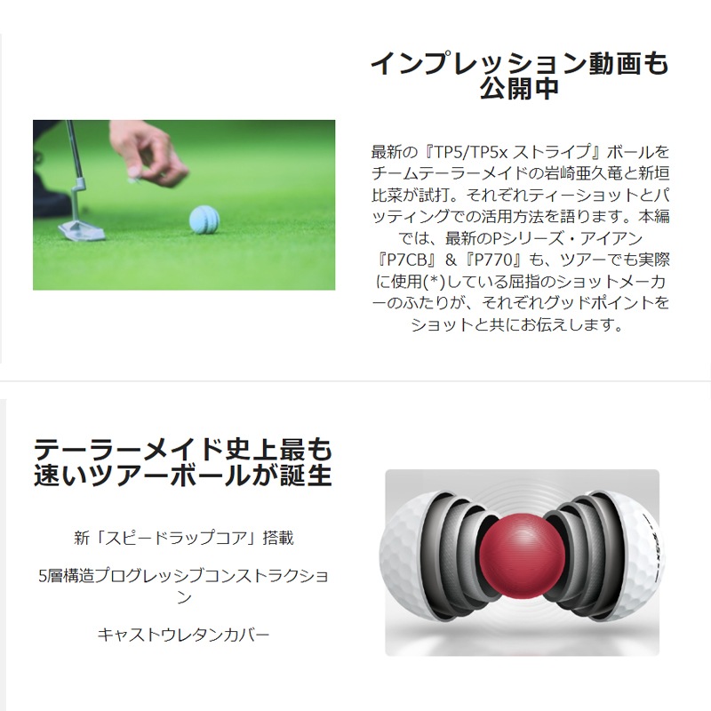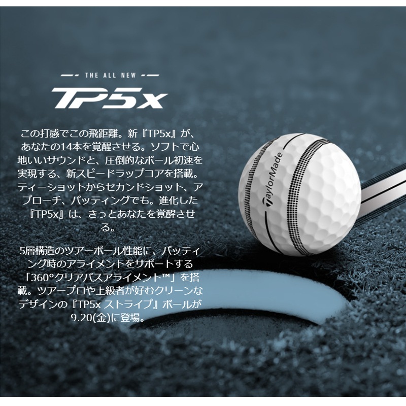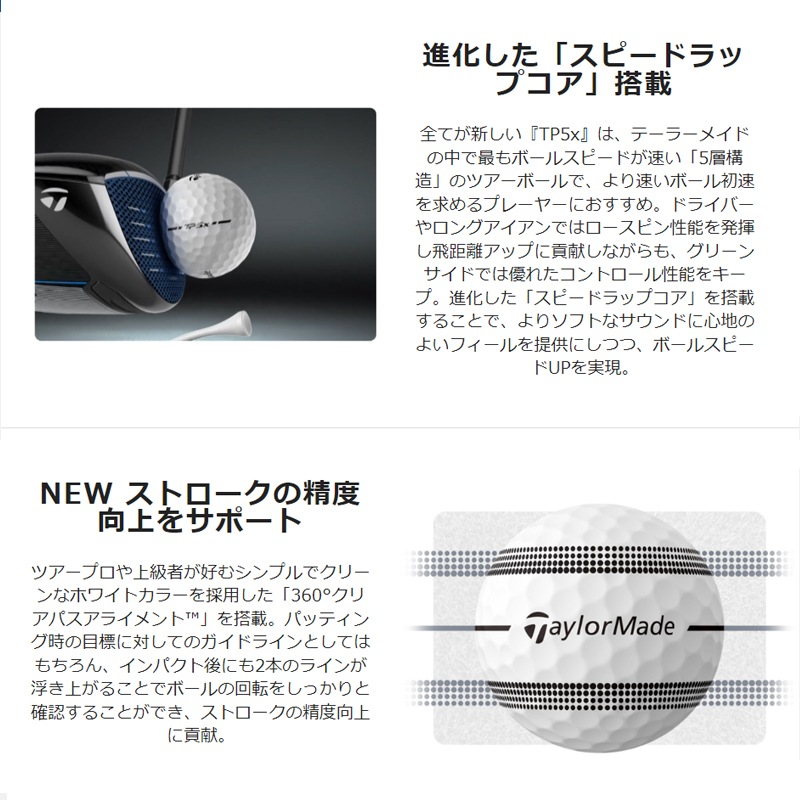 全てが新しい『TP5x』は、テーラーメイドの中で最もボールスピードが速い「5層構造」のツアーボールで、より速いボール初速を求めるプレーヤーにおすすめ。ドライバーやロングアイアンではロースピン性能を発揮し飛距離アップに貢献しながらも、グリーンサイドでは優れたコントロール性能をキープ。進化した「スピードラップコア」を搭載することで、よりソフトなサウンドに心地のよいフィールを提供にしつつ、ボールスピードUPを実現。